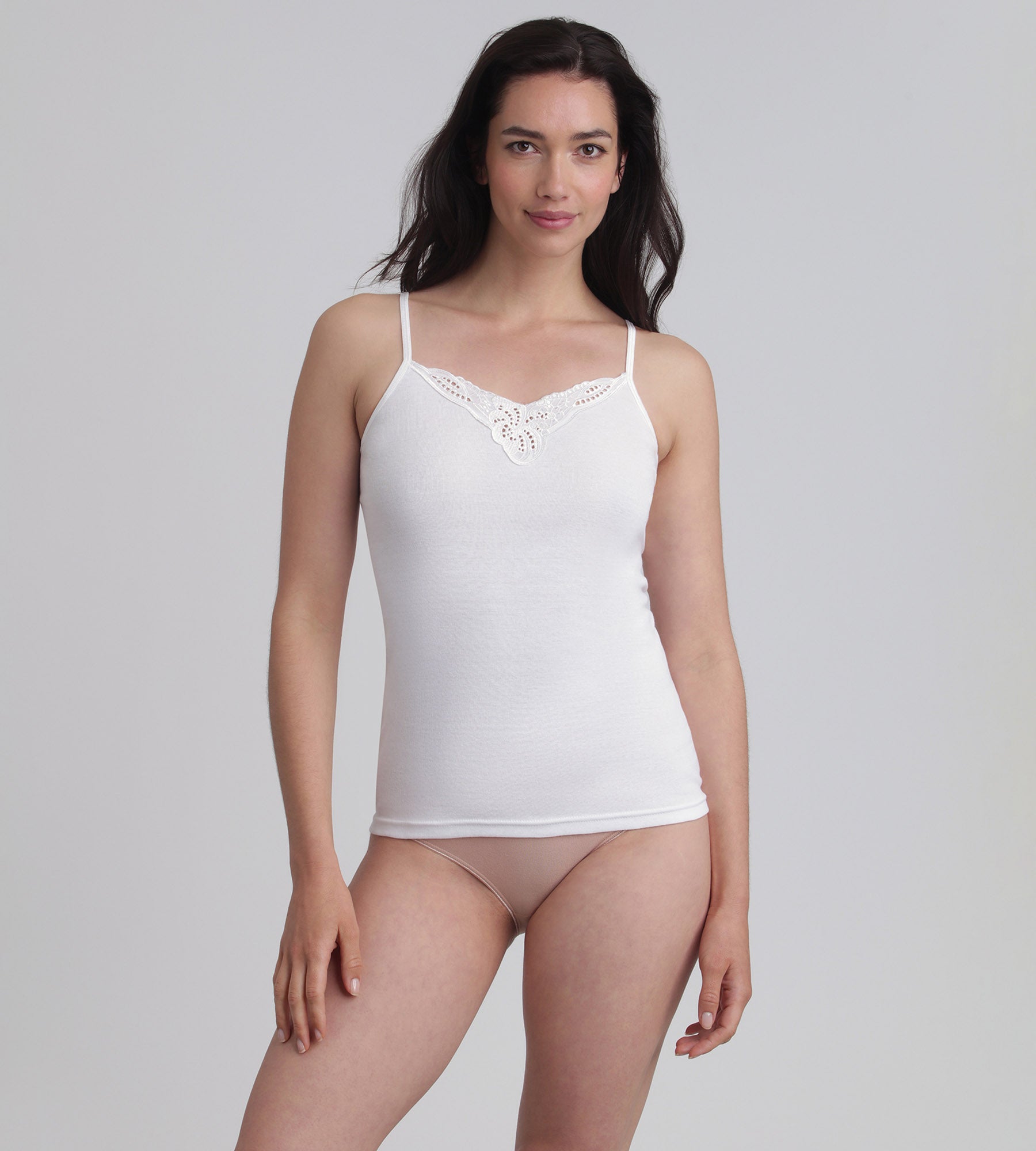 Discover the camisole in white Cotton Feminine: a stretch cotton for extra comfort, a refined embroidery at the neckline and a perfect fit for every women.This t-shirt is ideal when you need extra layer.