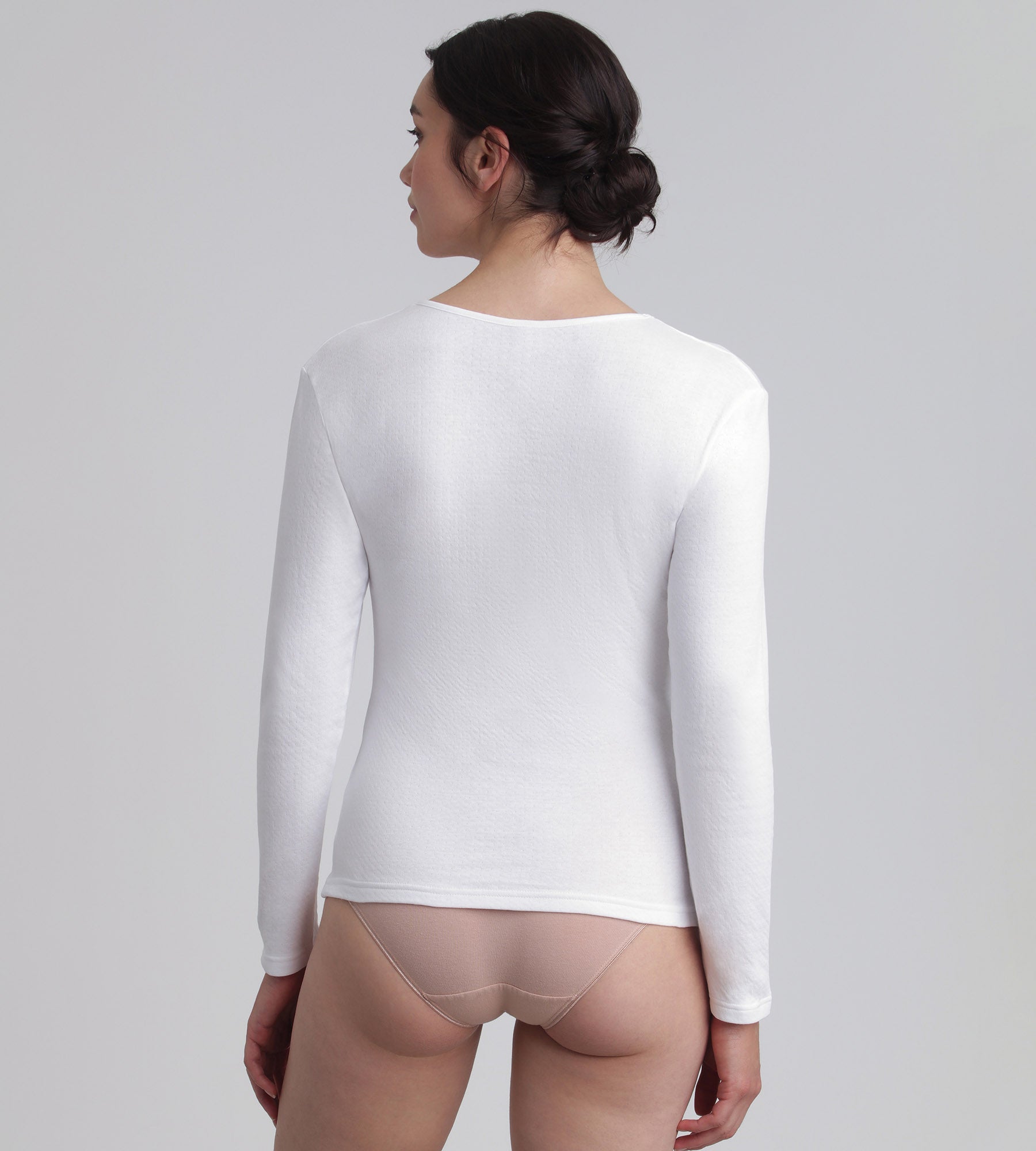 Discover our long-sleeved v-neck t-shirt in white from Thermal Natural collection. Optimal comfort guaranteed thanks to its ultra stretch and soft 100% cotton fabric. This long-sleeved t-shirt provides you warm effect when wearing thanks to its natural thermal fiber. Adopt the timeless design of this v-neck t-shirt for everyday wear. Wear it under your clothes or as a basic t-shirt with a jean.