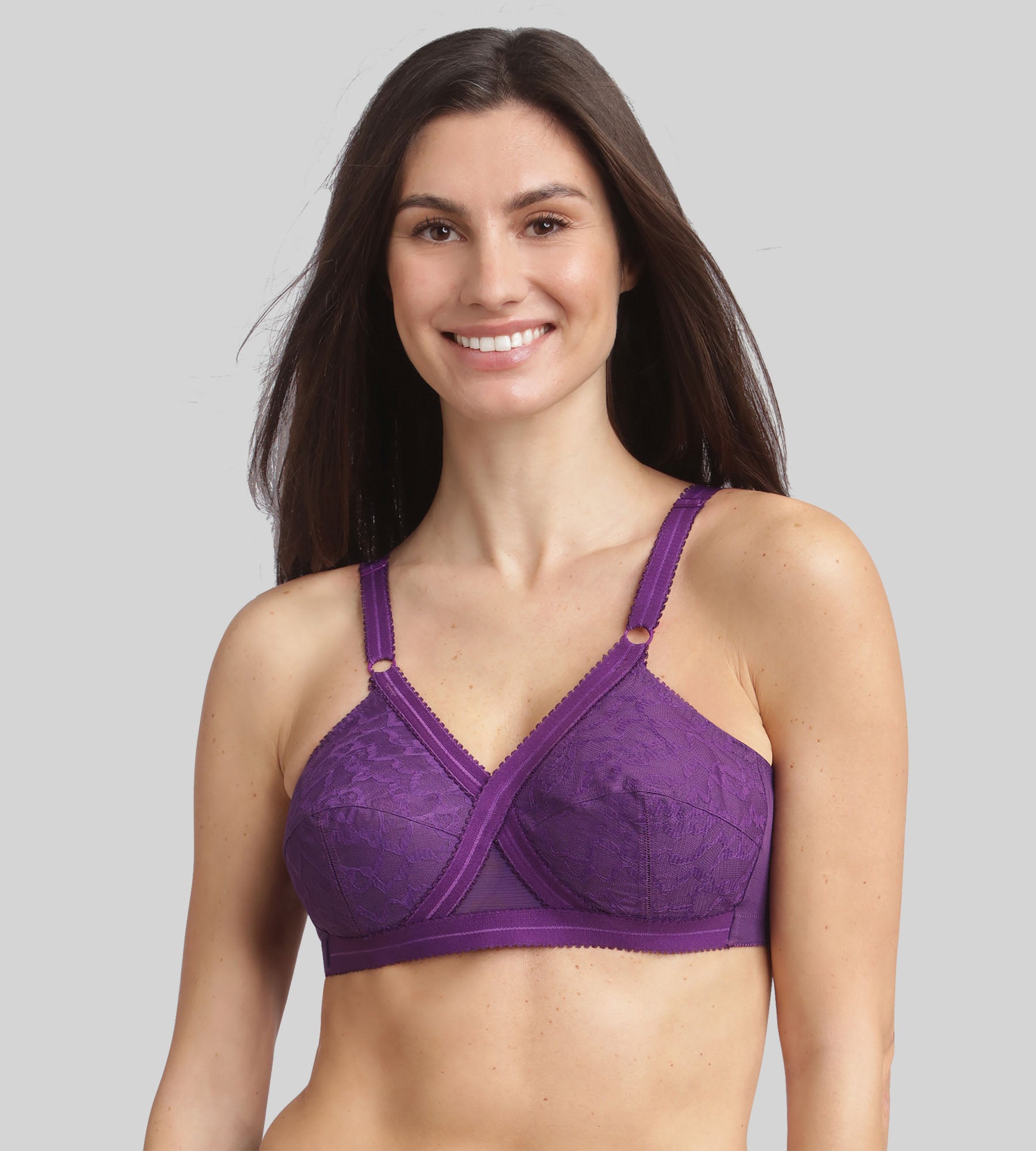 Discover the 556 Cross Your Heart bra in a soft and refined plum colour. A true Playtex® classic, this non-wired model offers unparalleled support thanks to its iconic crossed structure and wide adjustable straps. The full cups, highlighted with tone-on-tone lace, ensure a natural shape and an elegant look. Its dense, stretchy fabric provides ideal comfort, while its U-shaped back cutout guarantees perfect stability throughout the day.