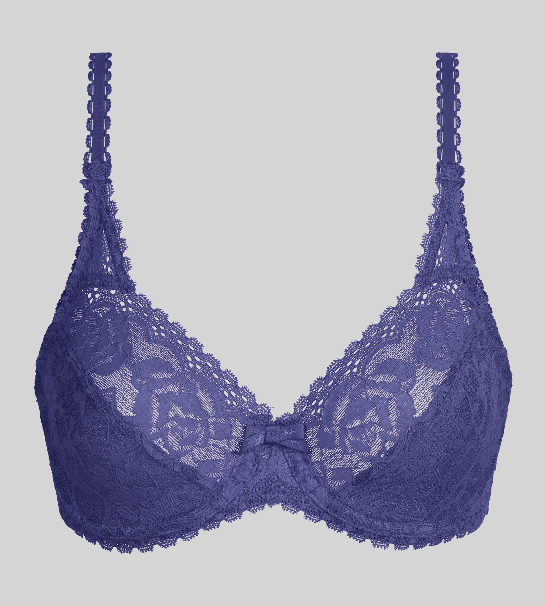 Fall in love with the Flower Elegance Recycled bra in cobalt blue, an intense and luminous shade that brings freshness and modernity to your lingerie collection. This model combines timeless elegance and optimal support, thanks to its full cups and ultra-soft stretch lace that hugs the bust. Its construction ensures excellent shape, amazing lift and a naturally rounded form. Designed for everyday comfort, this bra features discreet underarm pads to prevent pressure from the underwires and offer lasting comfort throughout the day. Its satin details and refined floral lace emphasise a feminine style, perfect for enhancing your curves.
